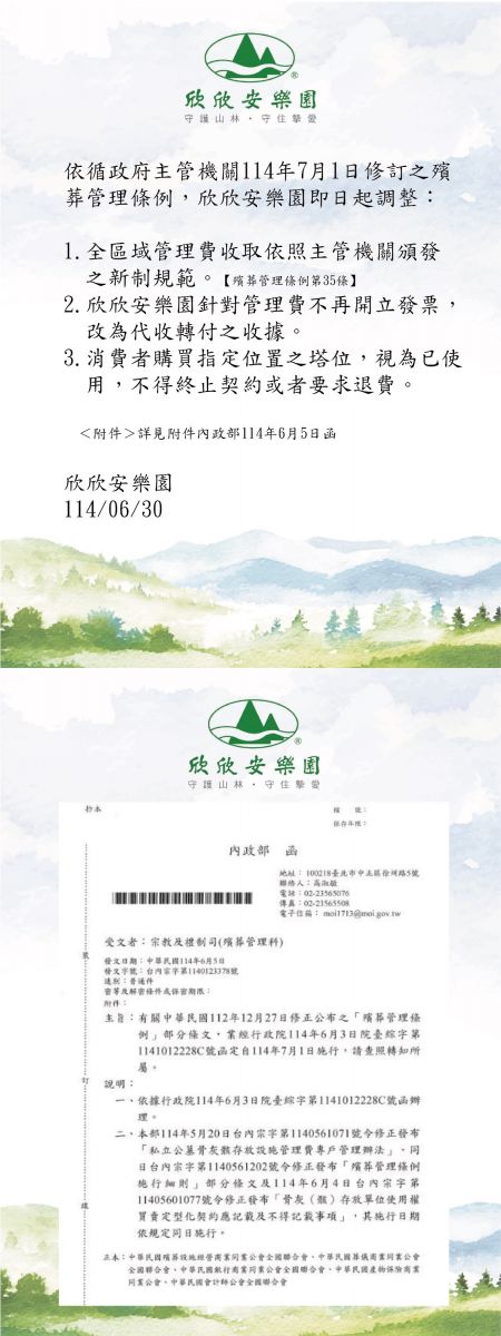 因應7/1殯葬管理條例之修正, 欣欣安樂園調整管理維護費收費