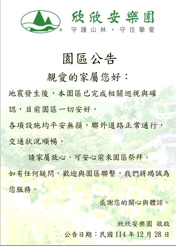 發表於 2025 年 12 月 29 日園區目前一切安好,聯外道路正常通行,交通狀況順暢,請家屬放心,可安心前來祭拜。